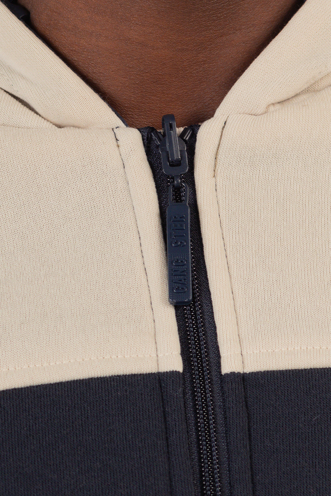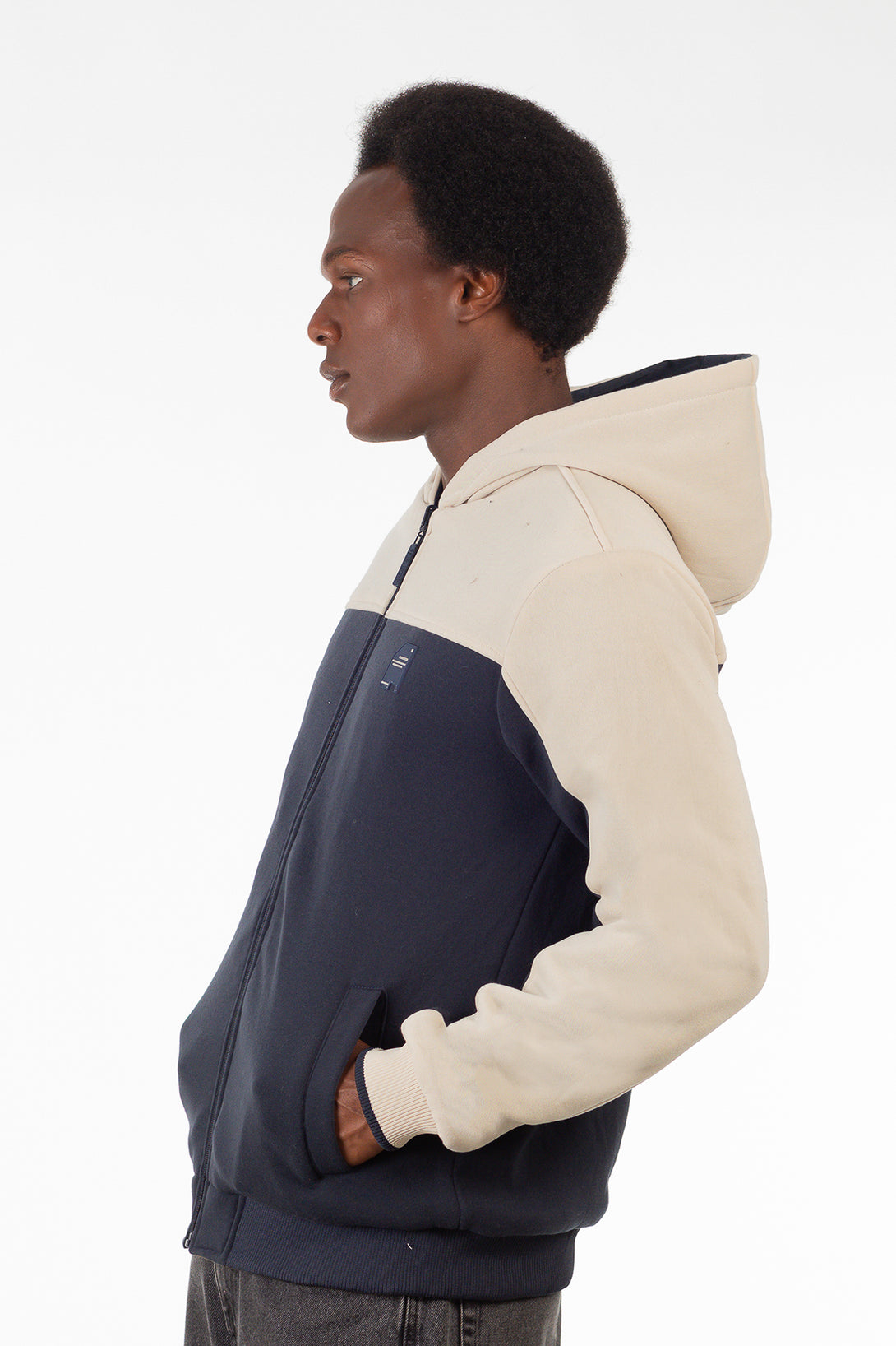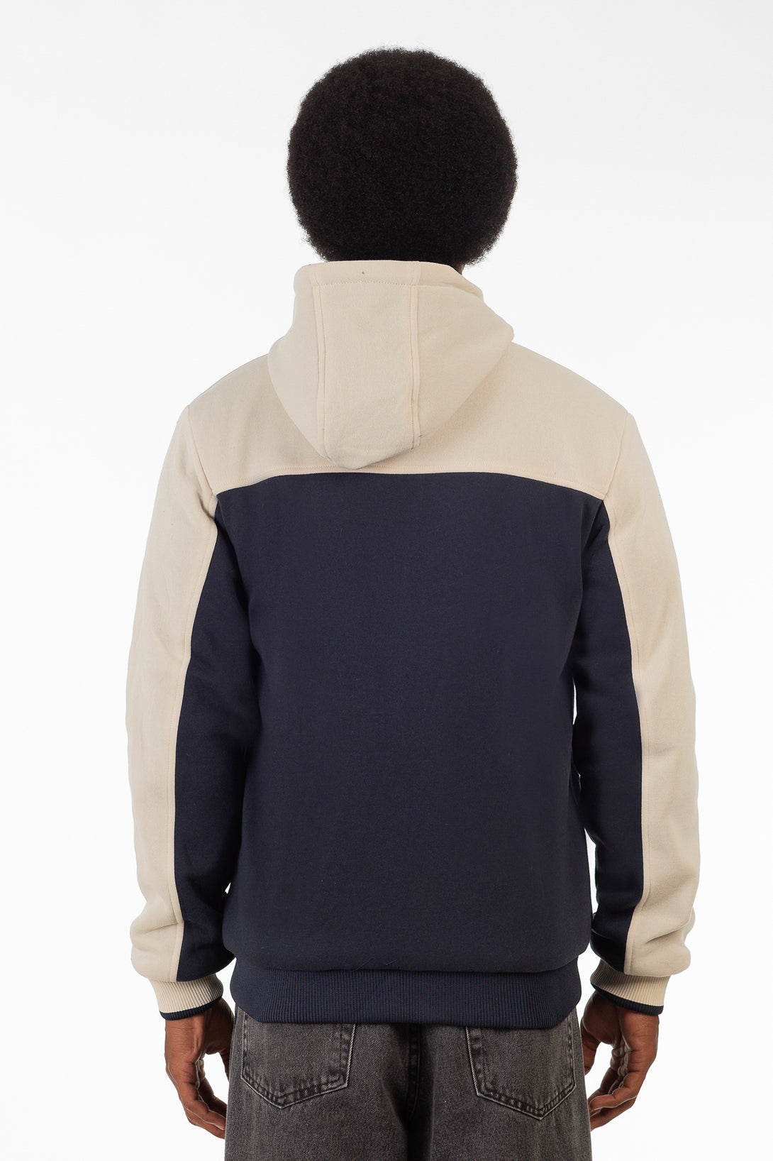 Campera deportiva con capucha en diseño bicolor azul marino y beige. Confeccionada en algodón, ofrece calidez y comodidad. Cuenta con cierre frontal y bolsillos laterales, ideal para looks casuales con estilo.